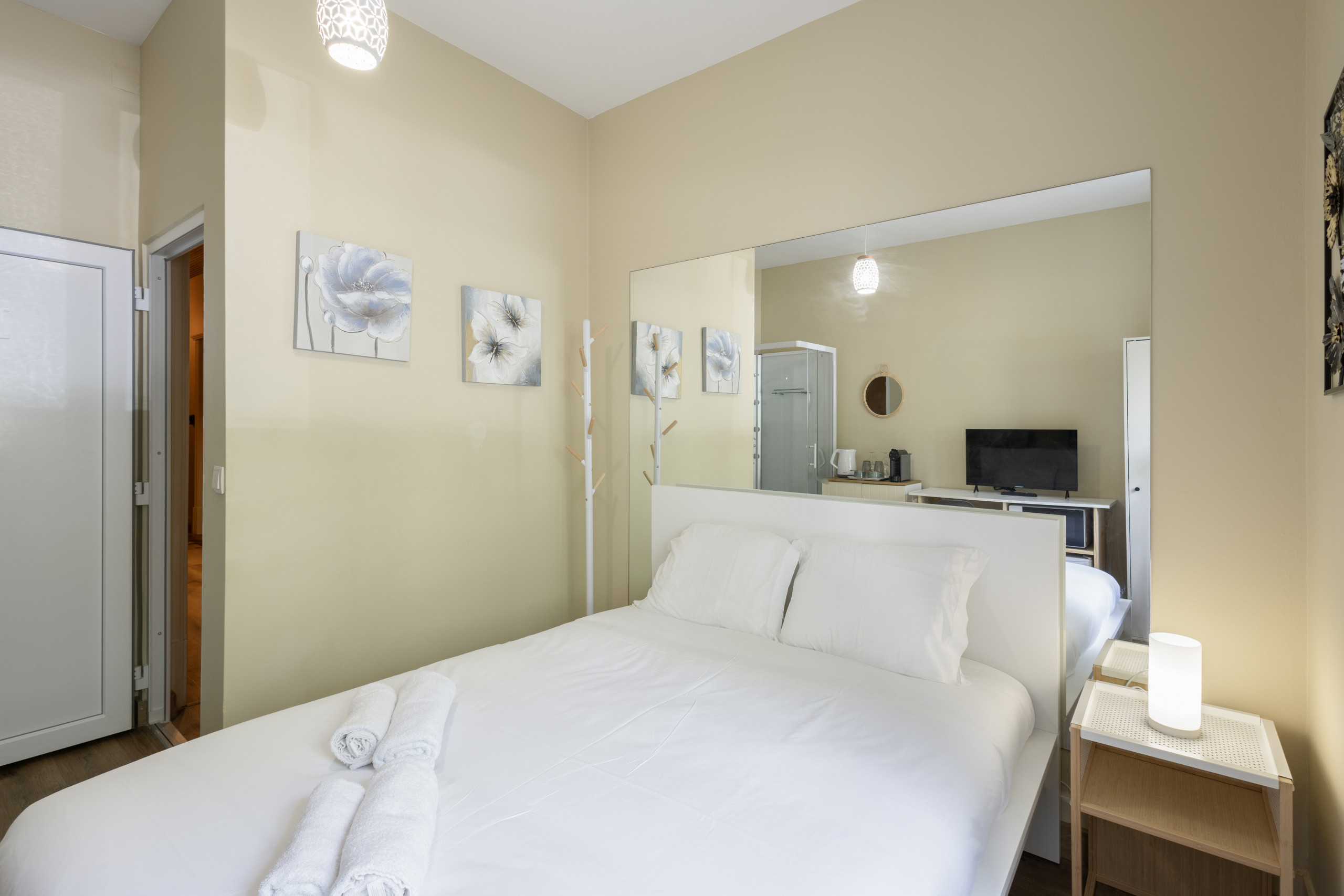 O quarto está totalmente equipada com frigorífico, microondas, máquina de café e jarro elétrico, ideal para preparares as tuas refeições ou um café quentinho. Tens também uma televisão para te entreteres nos momentos de lazer.