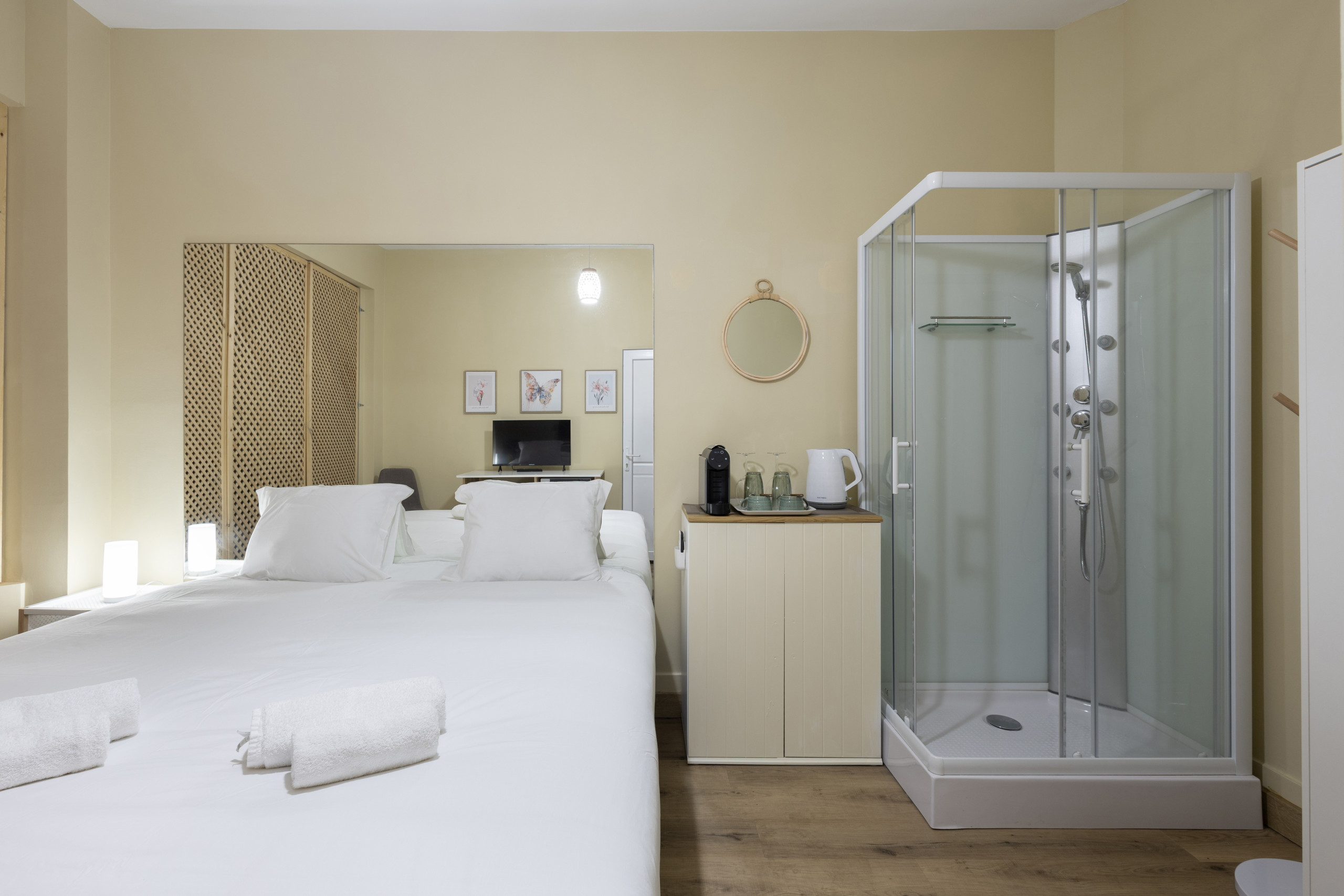 O quarto dispõe de 1 cama de casal e está equipado, com duche, sendo que a casa de banho é partilhada. Está equipado com ar-condicionado, garantindo o teu conforto em qualquer altura do ano. A conexão WiFi de alta velocidade mantém-te sempre ligado, e tens uma televisão para te entreteres nos momentos de lazer.