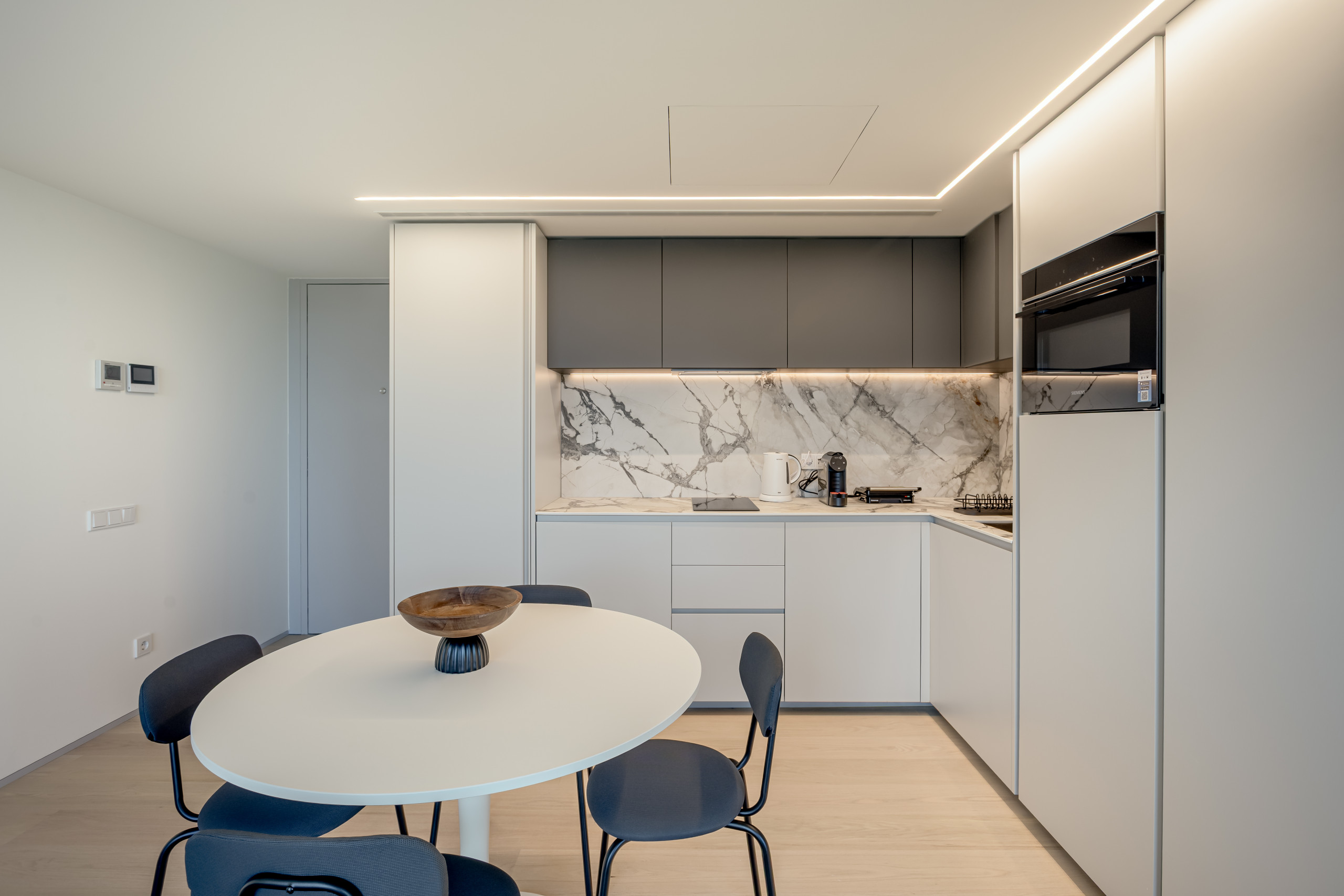 In the electric open plan kitchen, refrigerator, microwave, oven, freezer, dishes/cutlery, kitchen utensils, coffee machine, toaster and kettle are provided.