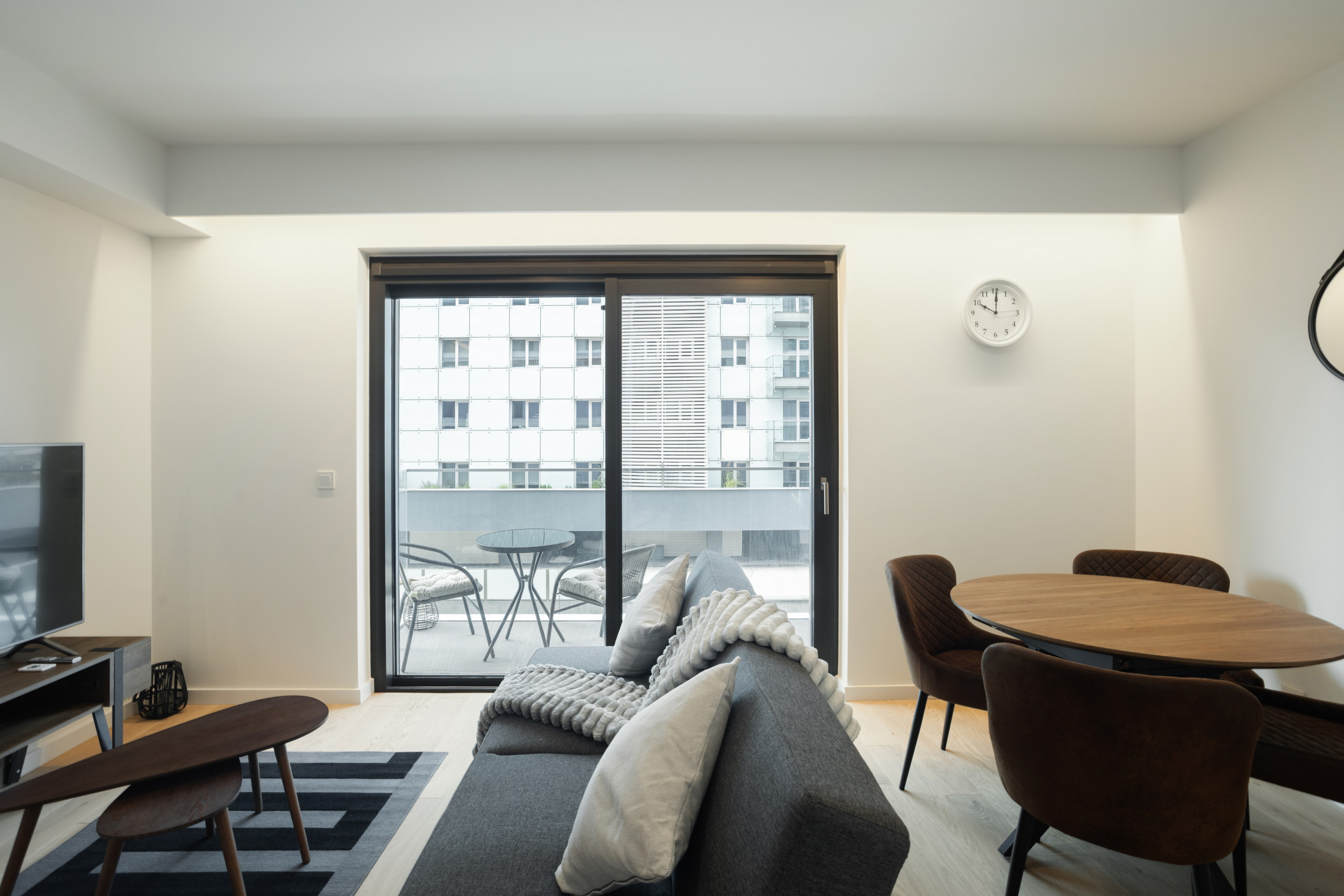 The space features a comfortable room equipped with a double bed and a sofa bed, allowing easy accommodation for up to 3 people. The American-style kitchen is fully equipped with modern appliances, including a washing machine, refrigerator, oven, dishwasher, microwave, and coffee machine, ensuring you have everything you need to prepare delicious meals.