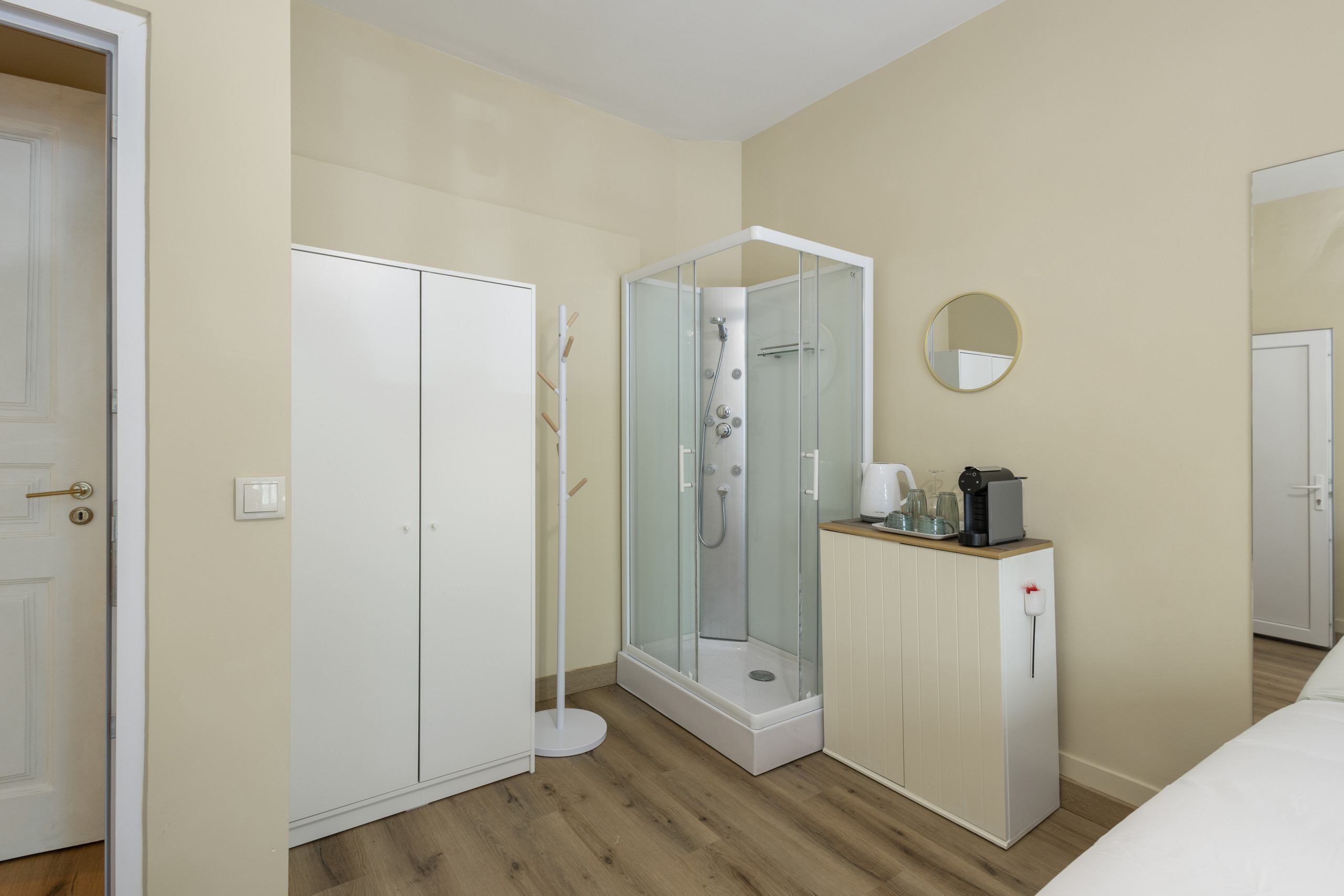 The room is fully functional and comes equipped with a refrigerator, microwave, coffee machine and electric kettle. Perfect for preparing your meals or a hot coffee in the morning.